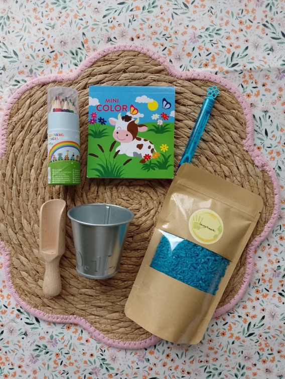 • 200 g kolorowego ryżu – doskonałego do przesypywania, sortowania i zabaw sensorycznych