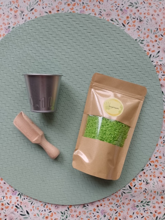 200 g kolorowego ryżu – idealnego do przesypywania, sortowania i tworzenia pierwszych zabaw sensorycznych